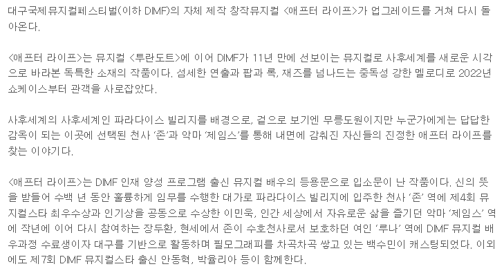 DIMF, 11년 만에 야심작 뮤지컬 ‘애프터 라이프’ 루나 역에 백수민 출연